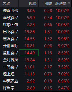 金融界12月11日音讯,大耗尽股早盘再度拉升,白酒、食物饮料、零卖等多个主义大涨,一鸣食物12连板。海欣食物、惠发食物、皇台酒业、李子园、金枫酒业等涨停。
