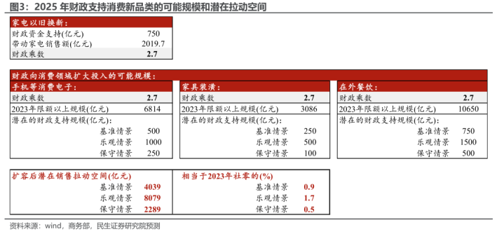 “正反应”有望复刻到哪些品类?从本年1-10月的社零增速与2023年全年对比来看,产品、餐饮均在偏冷区间(图2),有待计谋提振,再加上具备换新后劲的通信器材,以上三项可能是后续计谋扩容的“首选”。取上述家电耗尽2.7的撬动乘数,民生证券测算在基准情形下,来岁向新品类扩容的财政资金与本年耗尽品以旧换新的畛域调换,为1500亿元,可对应拉动约4000亿元的潜在销售空间,相当于2023年社零总数的0.9%。